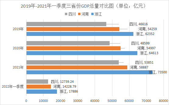 2022年一季度:浙江生产总值17886亿元,同比增长5.1%,高于全国增速0.3个百分点;河南生产总值14228.79亿元,同比增长4.7%,低于全国平均增速0.1个百分点,与浙江的差距在继续扩大;四川生产总值12739.24亿元,同比增长5.3%,高于全国平均增速0.5个百分点,与河南的差距进一步缩小。