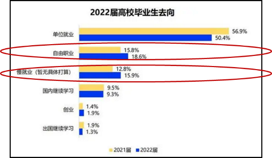 就业形势严峻。失业率有较大增长。全国城镇调查失业率2021年10月为4.9%,2022年10月为5.5%;全国16-24岁人口城镇调查失业率,2021年10月为14.2%,2022年10月为17.9%。疫情冲击造成高校毕业生就业形势严峻。《2022 大学生就业力调研报告》显示,2022年55% 的毕业生降低了就业期望,毕业生的平均期望月薪6295元,同比下降6%。在已签约的应届毕业生中,平均签约月薪6507元,同比下降12%。受雇就业比例明显下降,灵活就业、慢就业明显增多。北京大学发布的“全国高校毕业生就业状况调查”显示,2021届毕业生单位就业比例为32.1%,比2019年降低了5.3个百分点。2022 届高校毕业生中,灵活就业和慢就业比例分别上升了10.9%和9.7%。就业市场挤压效应进一步强化。《2022 大学生就业力调研报告》显示,“感受到求职竞争非常激烈”的应届生比例达到 61%,比去年同期上升 6%。