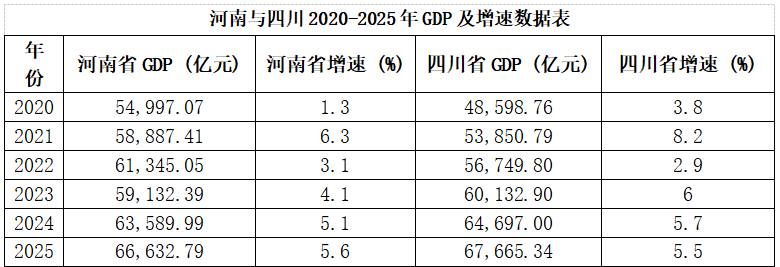 众所周知,中国创造了“两大奇迹”,即经济快速发展和社会长期稳定。数据显示,1978-2024年,中国GDP年均增速约9.1%;2013-2025年,年均增速约5.9%,显著高于同期世界经济年均增速(约3.1%)。事实证明,经济失速后果严重。受疫情和经贸形势不确定因素影响,2020年我国GDP实际增速只有2.3%,产业链中断等后果至今仍深刻影响着经济稳定发展。河南省经济总量长期位居中西部第一位,但2024年被四川省取代,与2020、2021年经济失速有直接关系。(见下表)